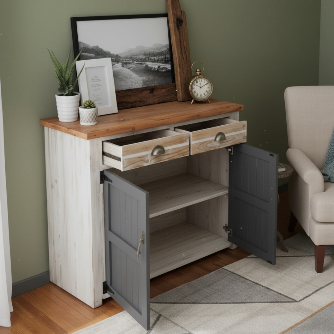 - Two cabinet spaces for storing home decorative items.